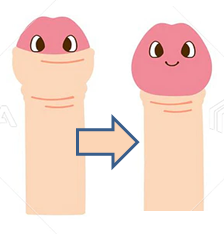 The illustration shows the transformation of a penis affected by phimosis into one with a fully retracted foreskin.