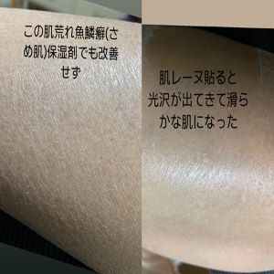 肌荒れが酷い50代女性 保湿剤を毎日塗っていたが治まらず落屑もボロボロ落ちる(左)そこで肌レーヌを貼って見た、わずか6日で右の様につるりとした皮膚に変わった。本来の保湿効果を出してあげると皮膚は正常に表にになって綺麗な皮膚が現れる。表皮が再生する途中で乾燥し鱗のような模様が入ってしまう。この効果は驚くべきものであった。一般の保湿ゲルは本当の意味での保湿効果はなく、10分程度水分を補給しているに過ぎないということであると分かった。肌レーヌで本来の皮膚を取り戻して下さい。